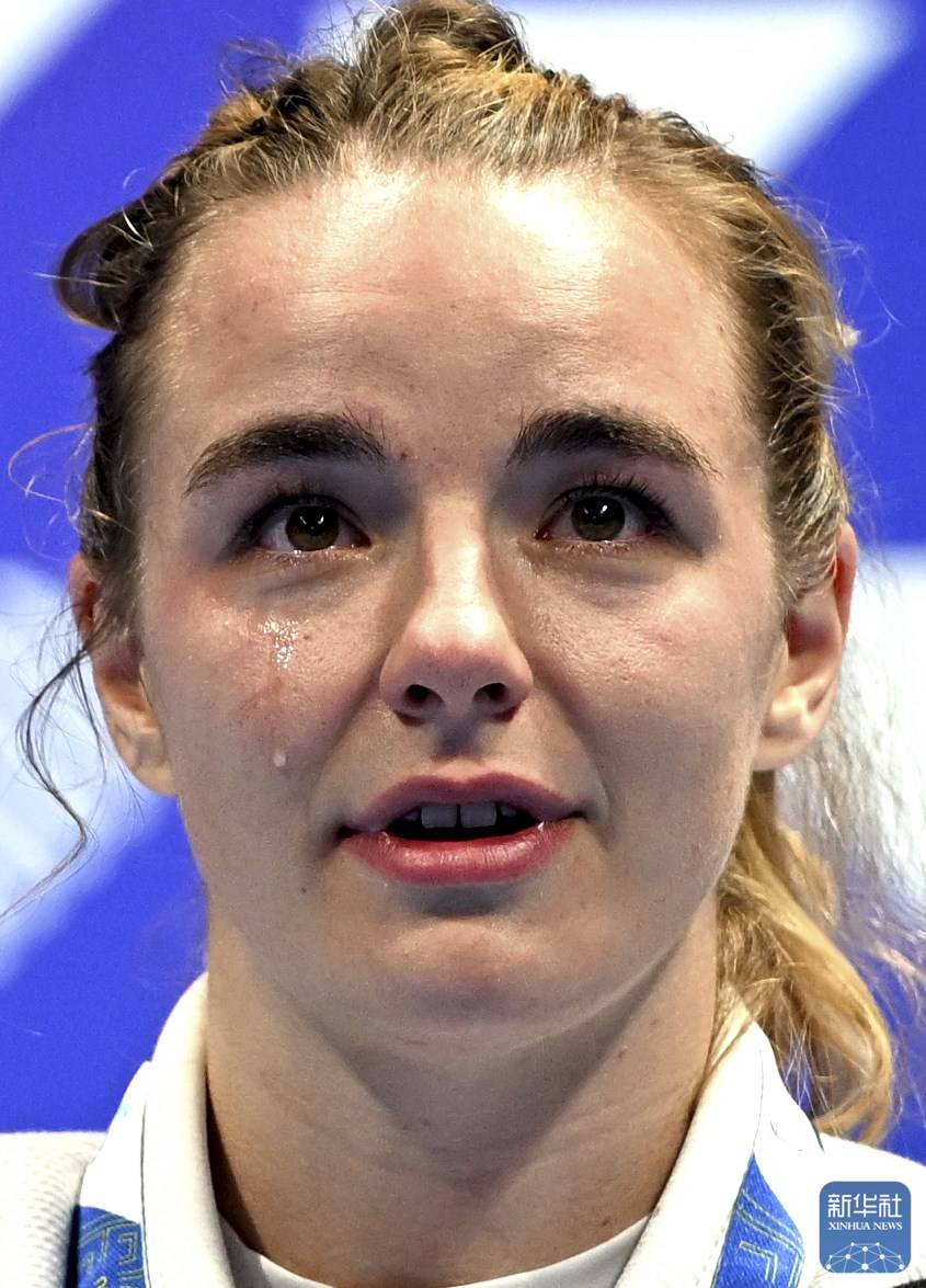 ↑冠军德国选手布舍尔在颁奖仪式上落泪。新华社记者 李嘉南 摄