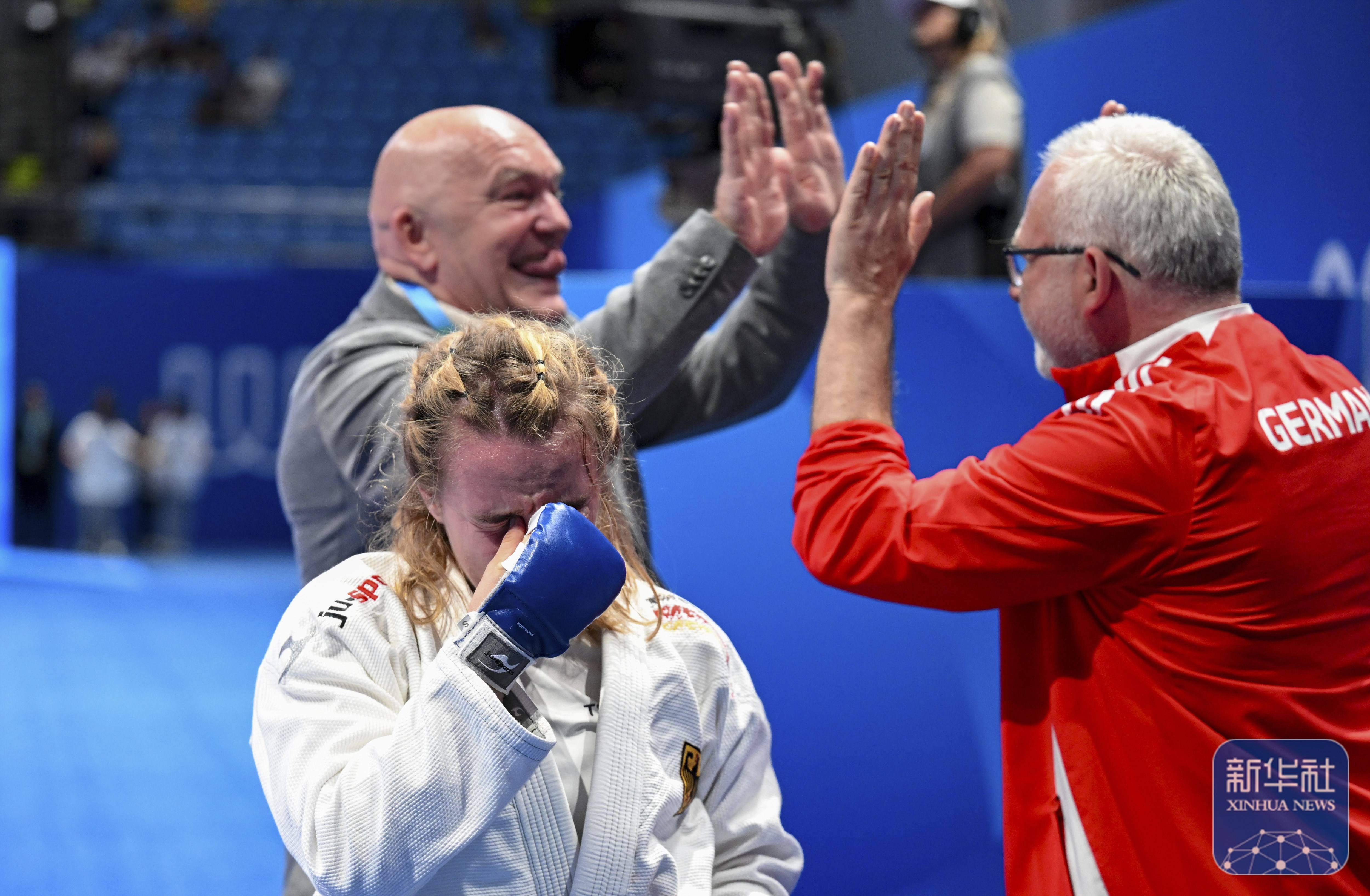 ↑德国选手布舍尔(左下)在夺冠后落泪。新华社记者 冯开华 摄